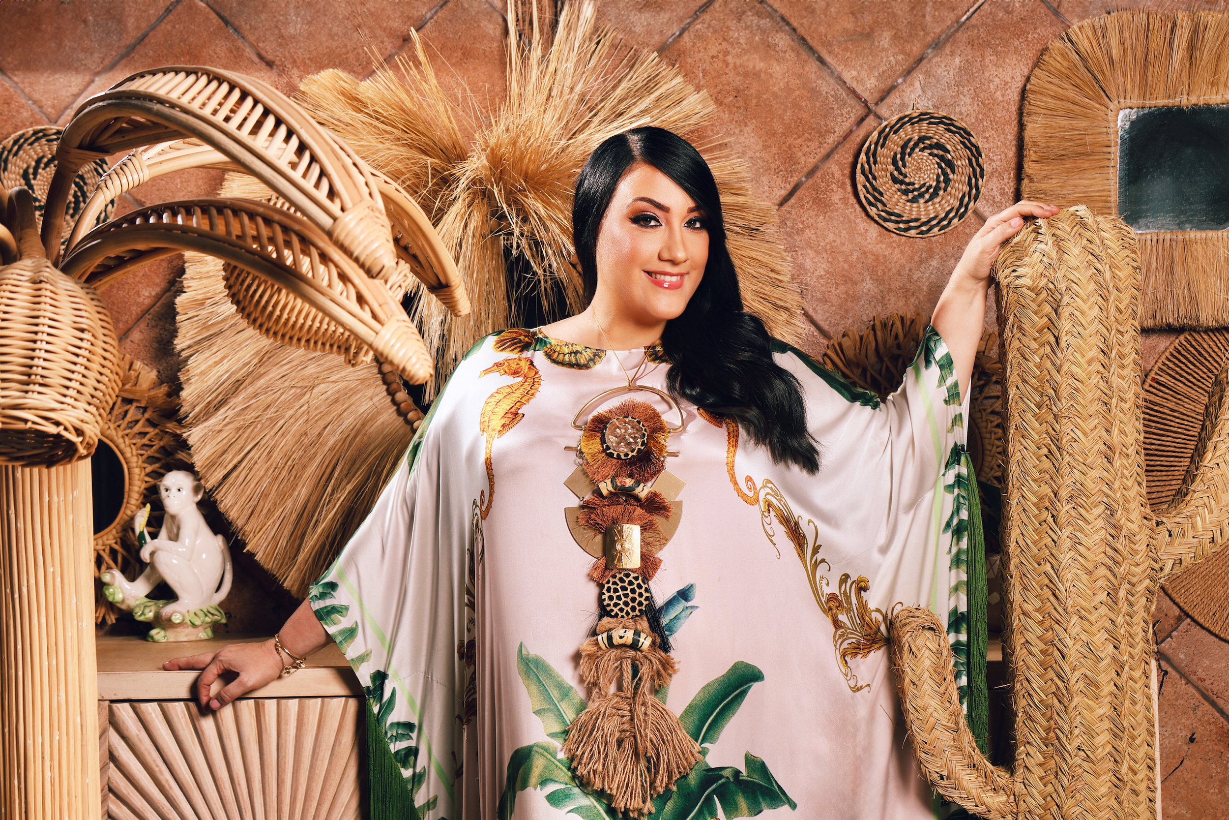 Giannina Azar exudes timeless elegance in a flowing floral ensemble paired with a bold statement necklace of gold, wood, and natural fibers. The look balances romance and strength, embodying her artistry and cultural storytelling in wearable form.