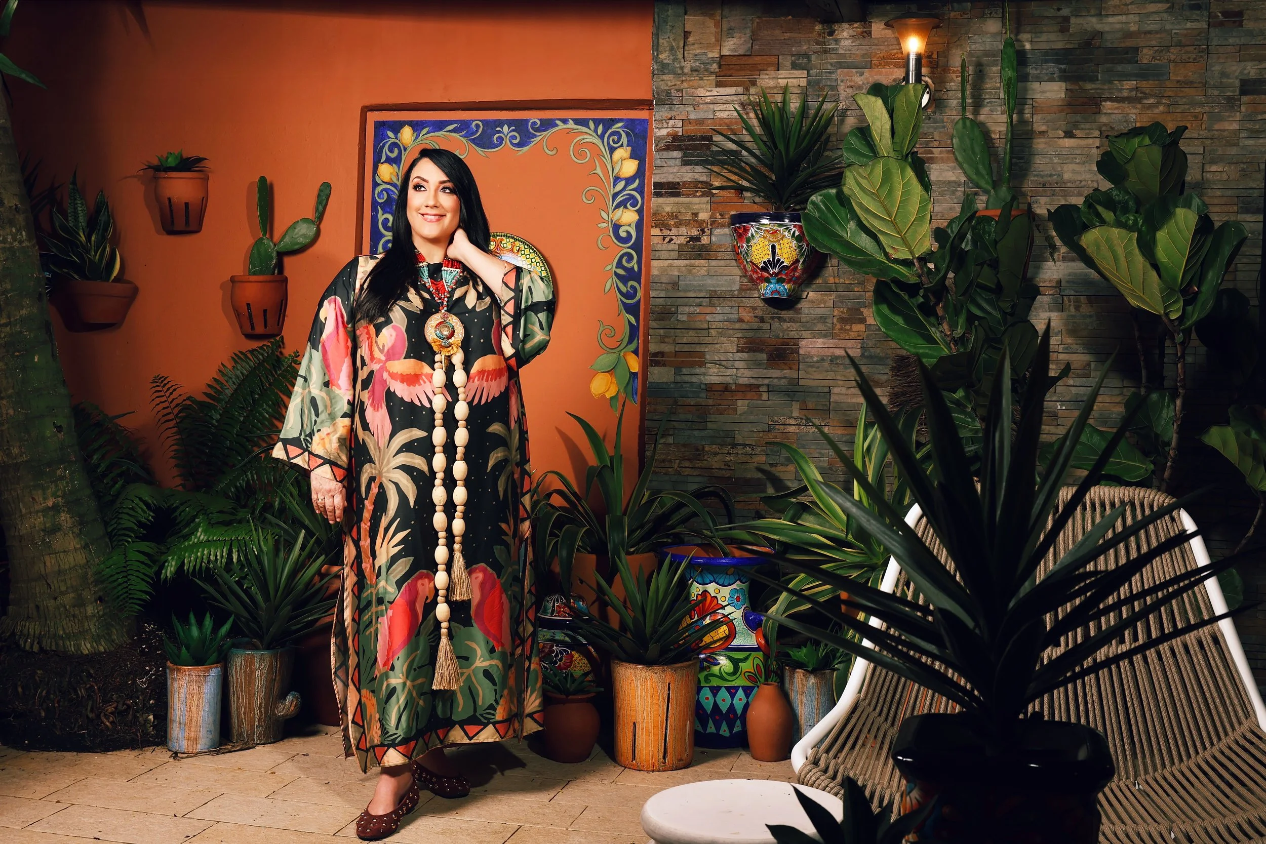 Giannina Azar exudes timeless elegance in a flowing floral ensemble paired with a bold statement necklace of gold, wood, and natural fibers. The look balances romance and strength, embodying her artistry and cultural storytelling in wearable form.